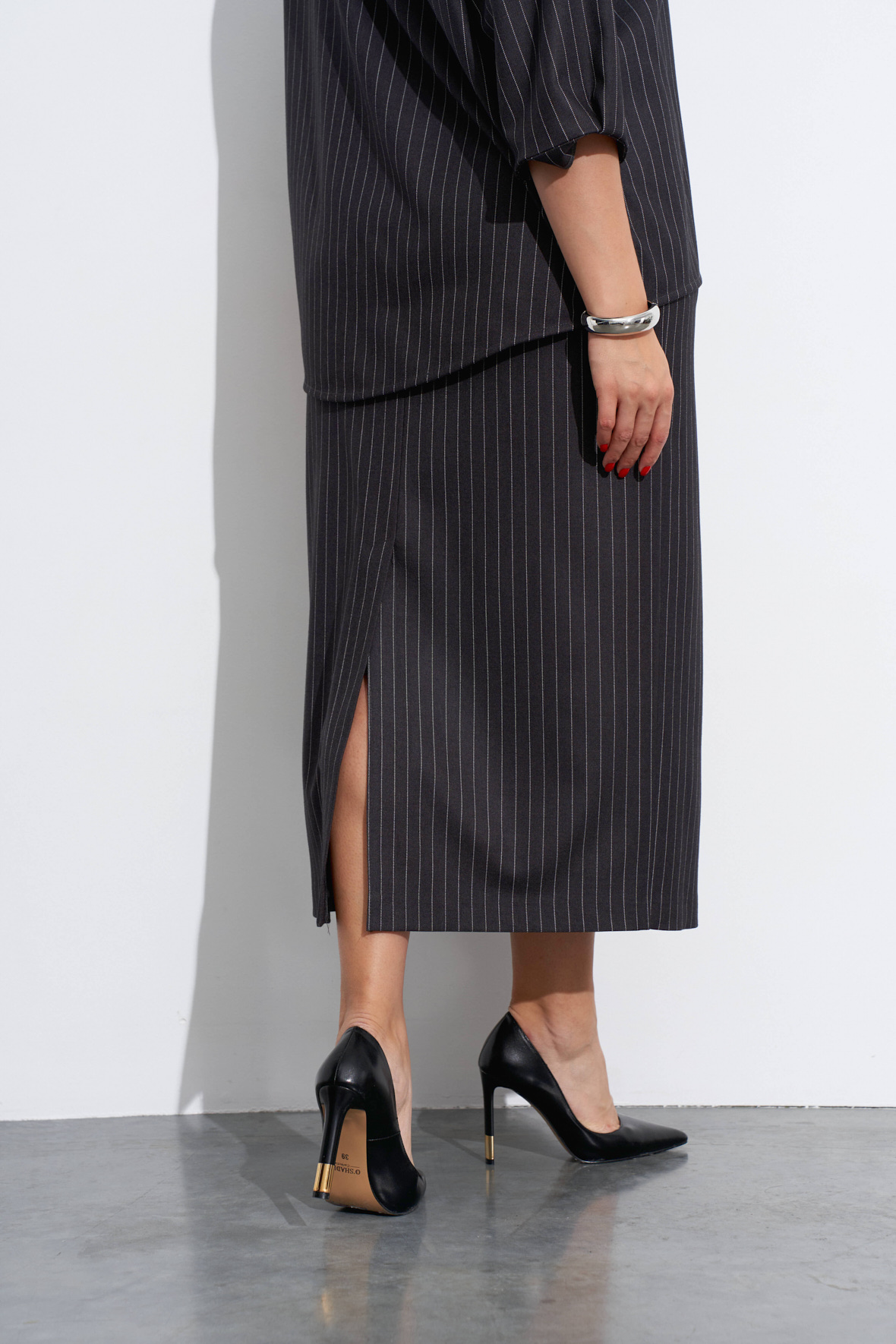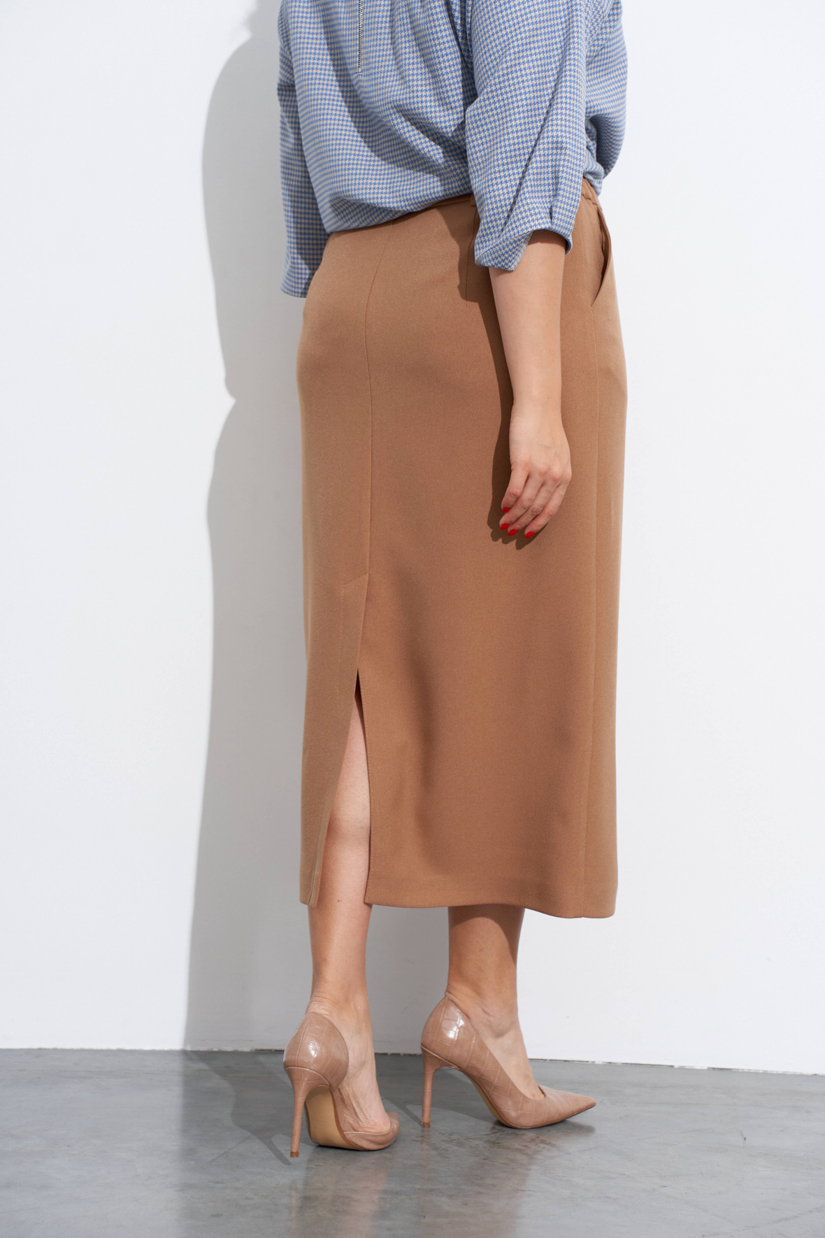 Юбка прямого силуэта. Спереди и сзади обработаны средние швы со шлицами в низу. На передних полотнищах обработаны карманы с косым входом и застёжка на молнию. Верх юбки на притачном поясе со шлёвками и эластичной тесьмой. Изделие на подкладке. Длина по боковому шву с поясом ок. 91см. в 52 м.